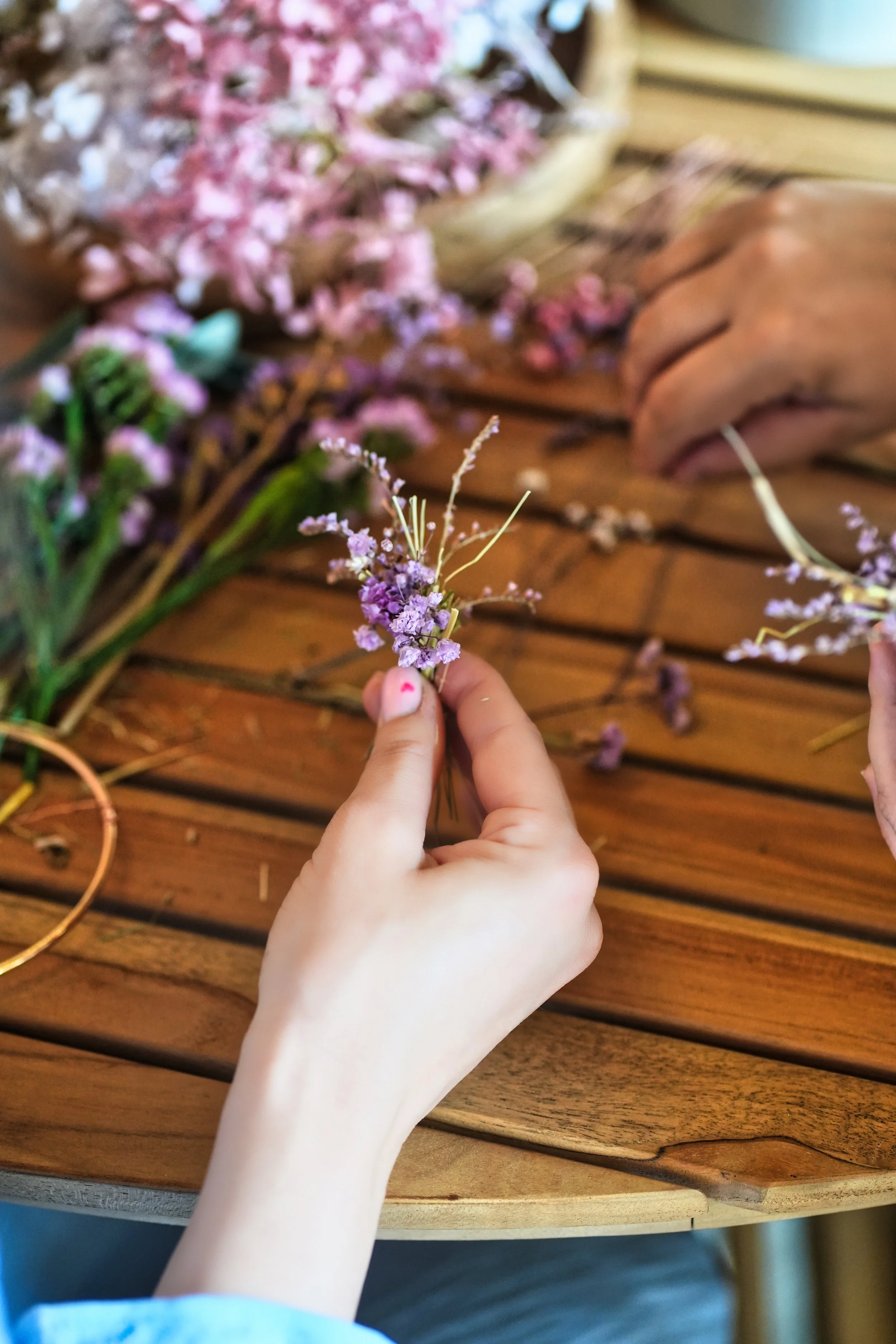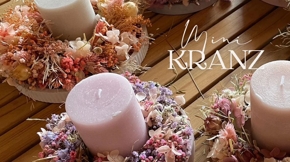 Bei diesem Workshop gestaltest du deinen Trockenblumenkranz auf einem 10cm großen, goldfarbenen Rohling. Dir steht alles zur Verfügung, was du für dein Kunstwerk benötigst. Du kannst aus einer großen Auswahl an konservierten und getrockneten Blumen deinen Minikranz nach deinen Farbwünschen gestalten.