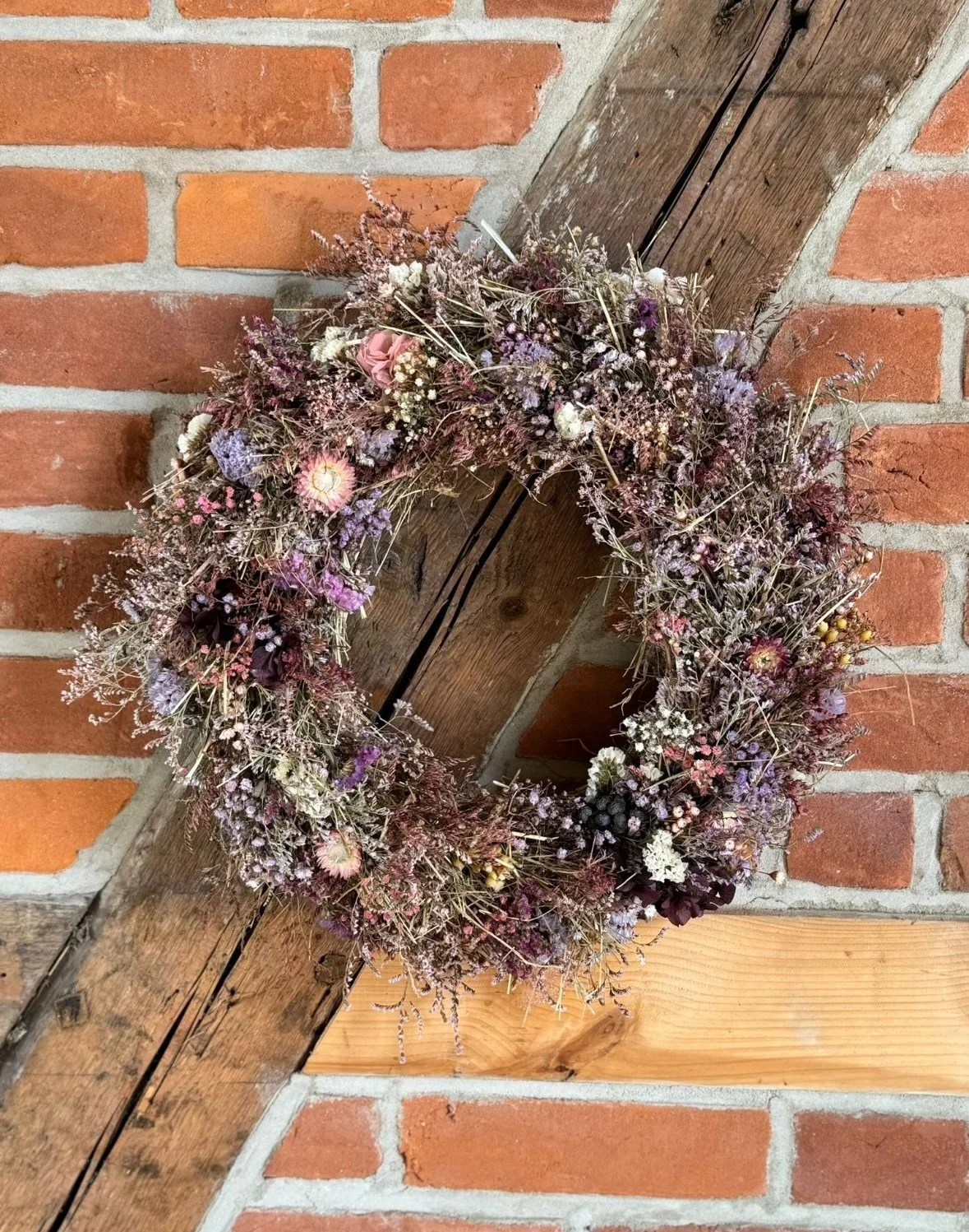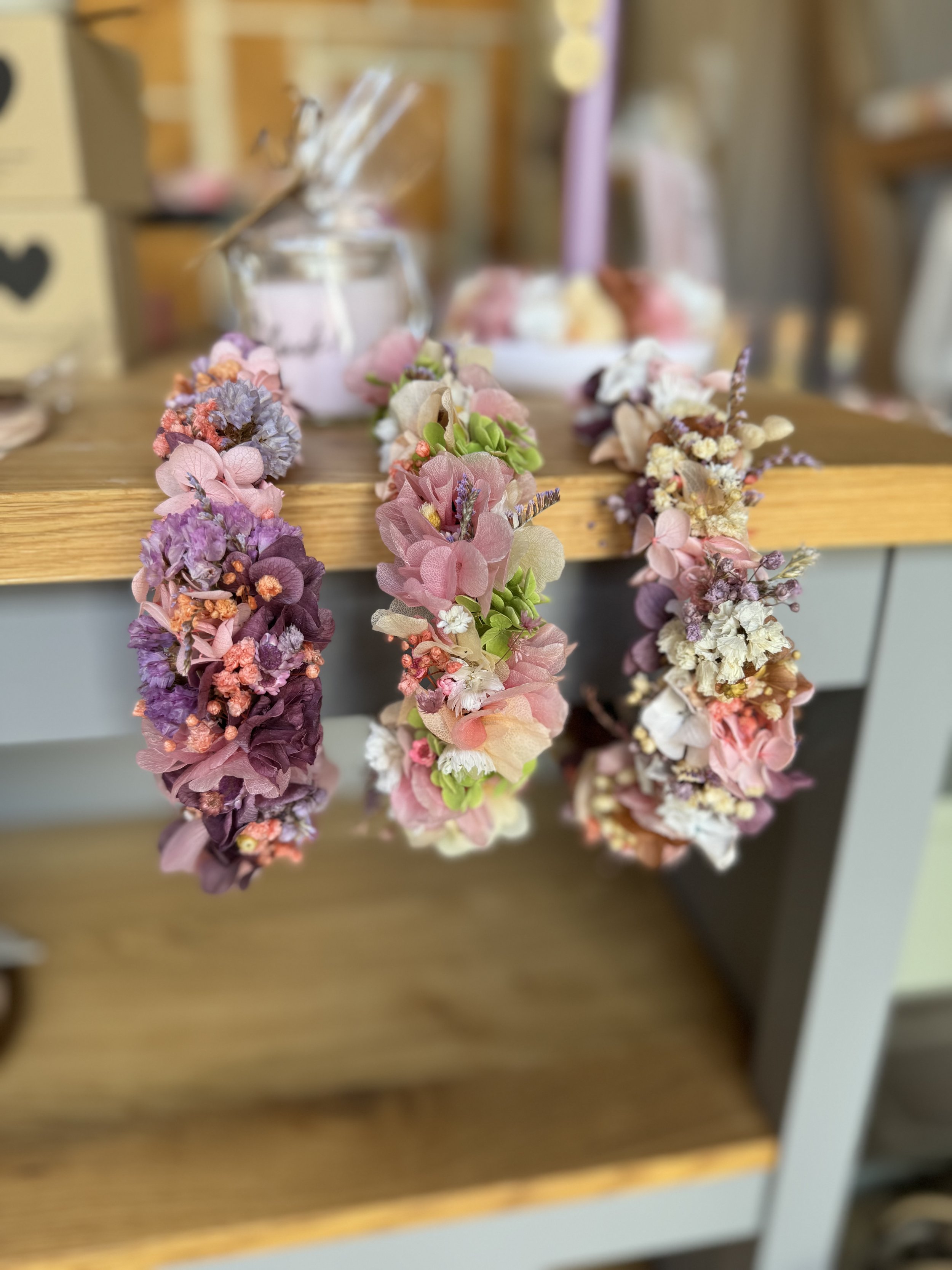 Du kannst aus einer großen Auswahl an konservierten und getrockneten Blumen deinen Kranz nach deinen Farbwünschen gestalten.